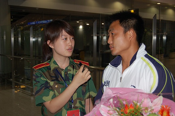 足球隊長袁微在接受校學生電視臺的采訪。