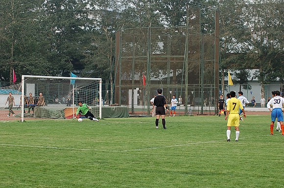 點球由我方6號“點球專家”于飛主罰,皮球應聲入網,場上比分變為1:1,直至中場休息。