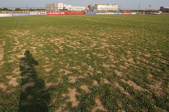 毫不夸張地說,場地內草地的覆蓋面積幾乎比露土的面積還要少,而且場地嚴重不平。這樣的場地,皮球是很難控制的,而且也很容易造成隊員受傷。