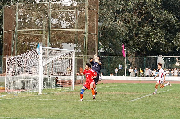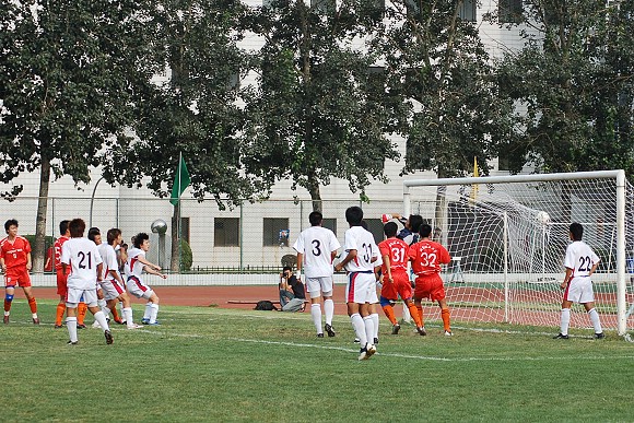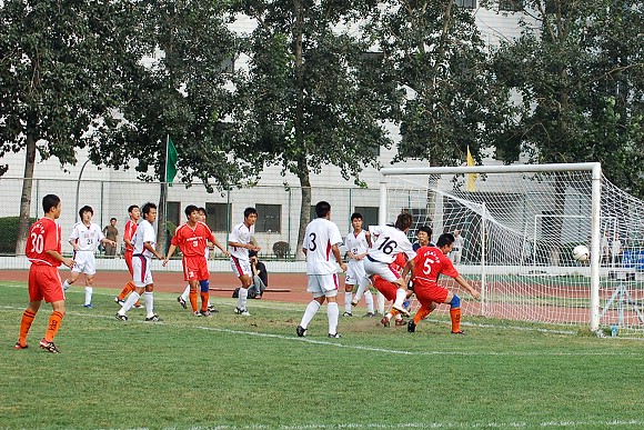 比較剛剛進行到第5分鐘,我方球員在對方禁區內爭頂。