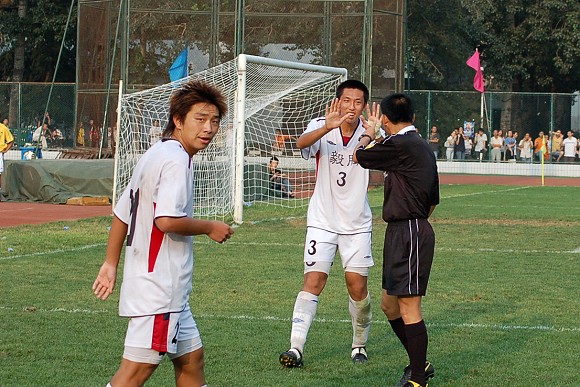 面對如此的偏袒行為,我校足球隊總教練金志揚也忍耐不住,向第四裁判提出交涉。