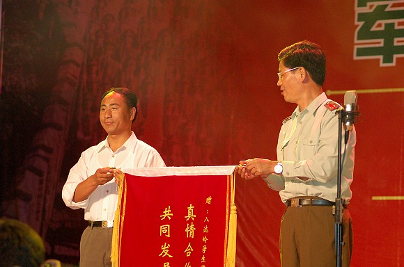 軍訓(xùn)總指揮劉明奇向軍訓(xùn)基地領(lǐng)導(dǎo)贈送錦旗。