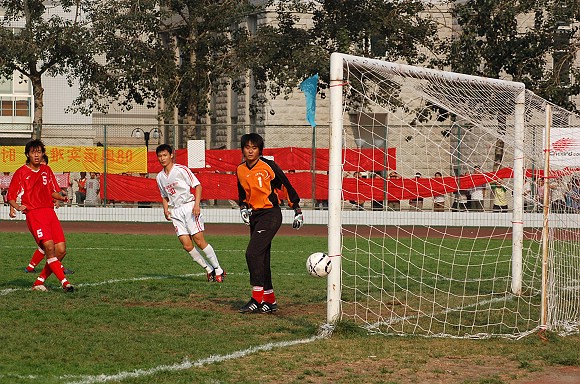 比賽剛剛開始,我校足球隊便展開了猛烈的攻勢,幾乎將天津東麗隊壓在了自己的半場。