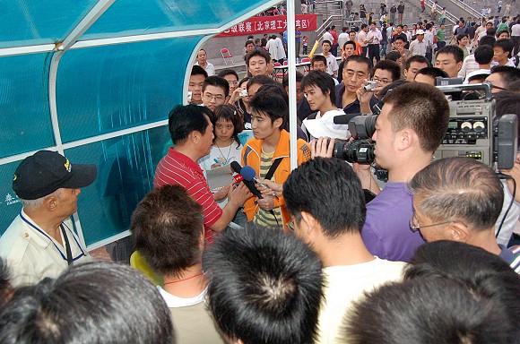 比賽剛剛結束,教練席已經被各大媒體圍得水泄不通,總教練金志揚在輪流接受各大媒體的現場采訪。