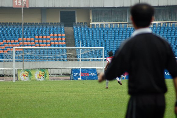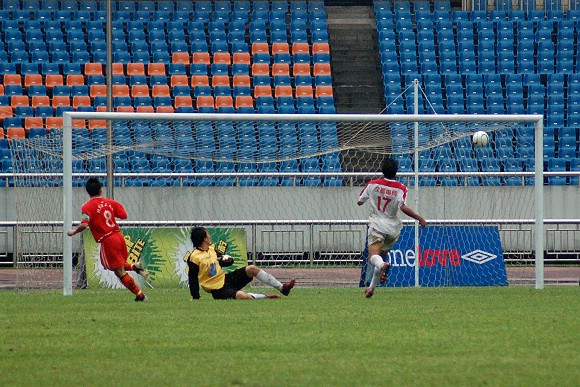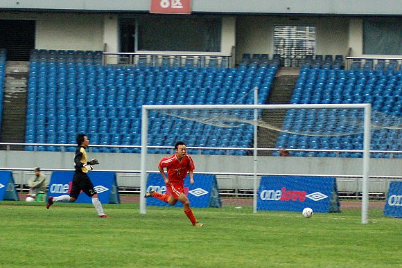 上半場第23分鐘,11號王強邊路突破,甩開了對方后衛(wèi)的阻擊,帶球進入禁區(qū)后果斷射門,但被對方守門員撲出,具有補球意識的王強順勢接著一腳補射,皮球應聲入網(wǎng),比分擴大為2:0。