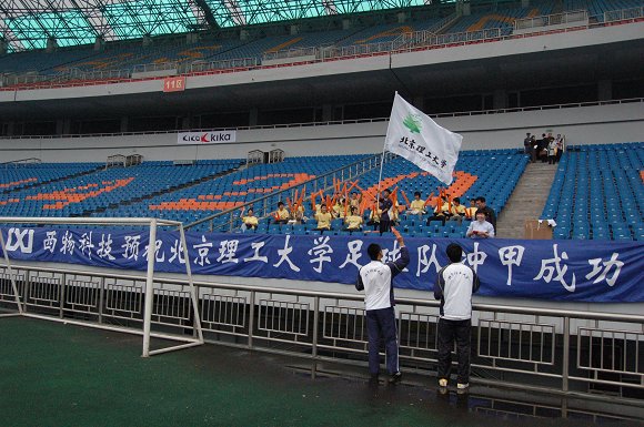 在整個決賽階段比賽期間,我校足球隊還得到了四川西物科技有限公司和重慶工學院的大力支持與贊助,他們還共同組成了我校球迷助威團,自從決賽階段的第一場比賽開始,他們就一如既往地為北京理工大學足球隊吶喊助威,使得我校足球隊所有隊員都感到了“賽場如主場,他鄉(xiāng)似故鄉(xiāng)”。