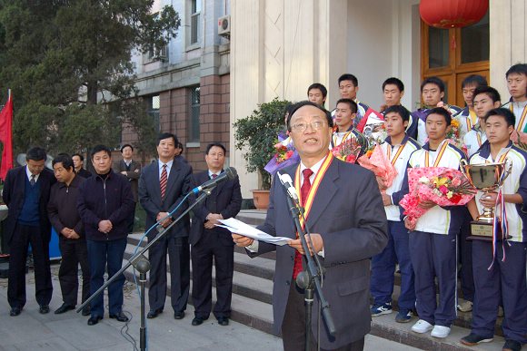 匡鏡明校長在講話中指出,我校學生足球隊在比賽中能取得如此驕人的成績,傳承了學校六十多年的光榮傳統(tǒng),是體育回歸教育、體育與教育結(jié)合的一次有益嘗試。他強調(diào),隊員的學生身份不會變,球隊“非盈利”的性質(zhì)不會變,以學校管理為主的體制不會變。他對足球隊提出了要求,足球隊要在更高、更新的起點上虛心向強手和職業(yè)隊學習,認認真真打好每一場比賽,為學校添彩,為大學生爭光。