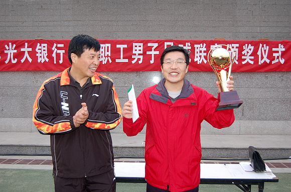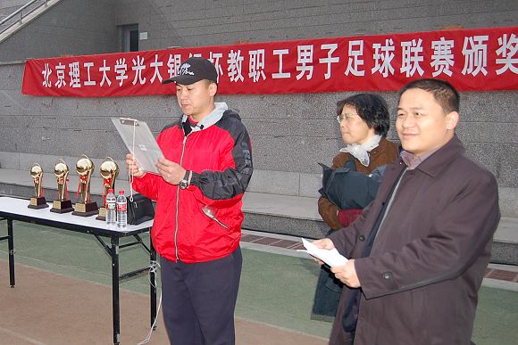 在11月19日舉行的北京理工大學(xué)“光大銀行杯”第二屆教職工男子足球聯(lián)賽閉幕式上,黨委副書記、工會主席侯光明到場并作了講話,光大銀行世紀(jì)城支行行長羅靜、行長助理李亞林到場并觀看了最后一輪比賽。