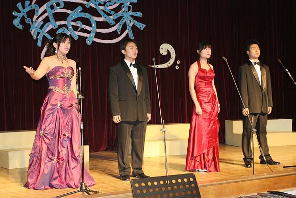 混聲四重唱《為什么不盡情歌唱》把現場氣氛推向了高潮。這是捷克斯美塔納歌劇《被出賣的新嫁娘》中的著名唱段。最后,大家欣賞到了兩組中國民歌?!兑拭缮叫≌{》、《洗衣歌》、《草原上升起不落的太陽》等大家耳熟能詳的歌曲,把觀眾再一次帶入回憶之中。