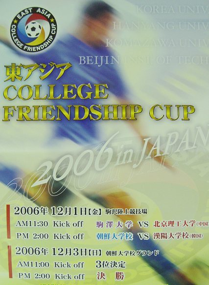 北京理工大學足球隊于11月29日啟程并順利抵達日本東京奧林匹克青少年活動中心,在即將開始的三國四隊的東亞大學生足球邀請賽中,12月1日將與日本的駒澤大學隊首先交手(由駒澤大學隊主力隊員組成的日本大學生足球隊曾連續獲得2003年和2005年兩屆世界大運會足球比賽的冠軍,在2003年韓國世界大運會足球項目的八進四比賽中,由我校足球隊組成的中國大學生足球隊與其戰成平局,最后在點球大戰中惜敗,爾后取得了第七名的成績),獲勝的球隊將在12月3日與朝鮮大學隊和漢陽大學隊之間的勝者爭奪冠軍,而首戰落敗的球隊將只能在同一天爭奪第三名。由于我校足球隊是以四屆全國大學生足球聯賽冠軍和剛剛沖入中國足協甲級聯賽的惟一一支“學生軍”的身份應邀參加此項國際大學生足球賽事,在國家隊、國奧隊、國青隊、國少隊一路走低的情況下,這項代表著東亞大學生足球最高水平的賽事也引起了足球界及各大媒體的廣泛關注。