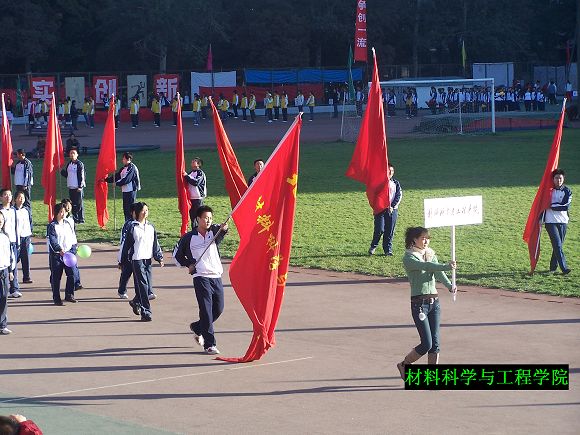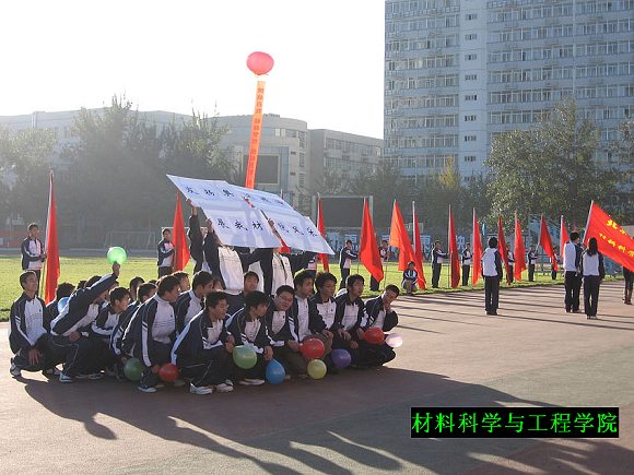 入場式上我院打出了“發揚奧運精神,展我材院風采“的標語表達志愿奧運的信心