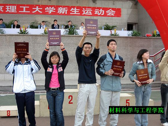 各學院在本次新生運動會中都賽出了風格、賽出了水平,一天的比賽很快畫上了圓滿的句號。我材料科學與工程學院新生們以良好的精神狀態和賽場上的優異表現,贏得兄弟學院的廣泛認同,喜獲精神文明獎評比的第一名(圖為學生會體育部長沈久臻同學〈左起第三人〉代表學院上臺領獎)。