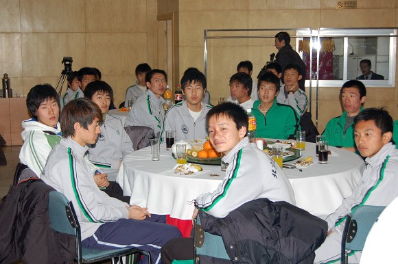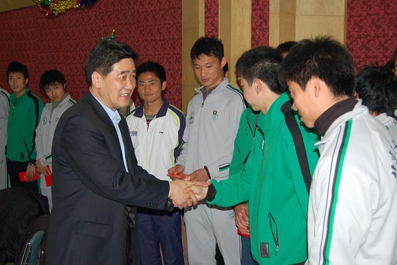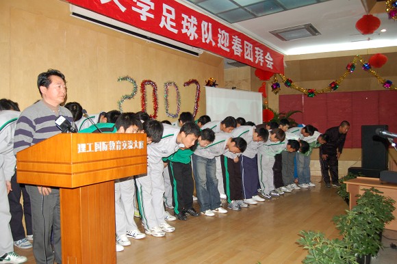 團拜會上首先由北京理工大學黨委副書記、副校長楊賓發言,他首先對多年來上級單位、各類媒體、企業界對北京理工大學足球隊的一貫支持表示感謝!楊賓副書記回顧了北京理工大學足球隊的發展歷程,以及2006年足球隊沖甲的輝煌一刻。楊賓在會上表示,學校將根據中甲聯賽的要求,在伙食上做出比較大的改善,將專門請營養技師為隊員營養配餐,為隊員建造獨立的就餐場所。以保障他們在訓練和高對抗比賽中所需的營養。此外在學習中,學校將根據賽程調整課程,在利用業余時間請學校最好的老師進行文化課的輔導。同時在訓練中加強科學性,把在韓國所學充分延續,以提高訓練效果為主進行有效果的訓練,而不是以訓練時間為標準。他最后強調,希望隊員要有使命感,要有榮譽感,要充分表現出體育回歸教育的理念。關于2007年足球隊征戰中甲的備戰情況,他表示學校各級領導都將會全力支持足球隊的各項工作,同時也希望在足球隊的招商方面能得到社會各界尤其是民族企業的關注。
