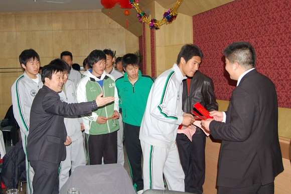 與會領導和嘉賓還一起向足球隊全體隊員發放了過年紅包,希望大家回家之前為父母準備一些禮物,盡到孝心。