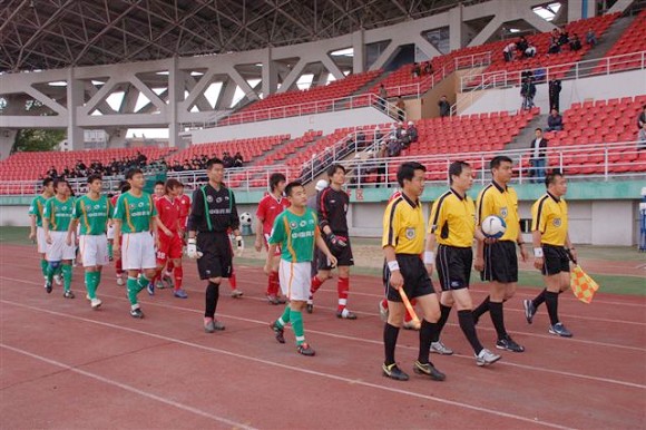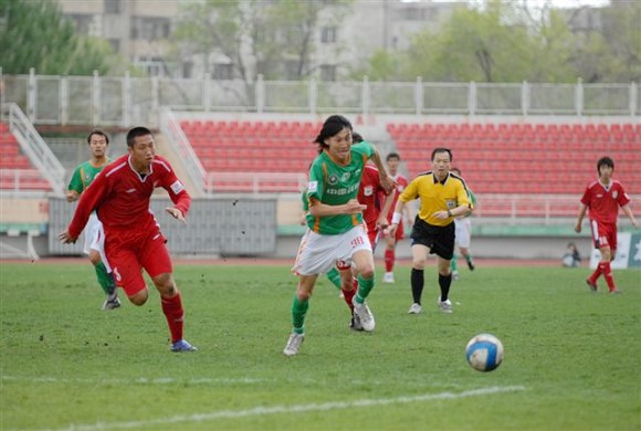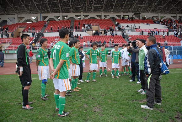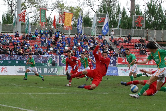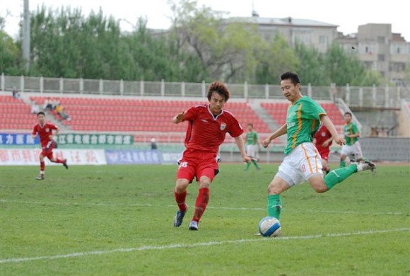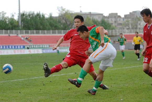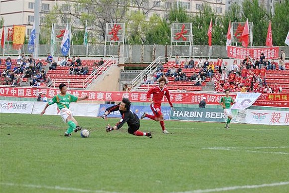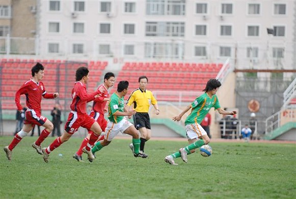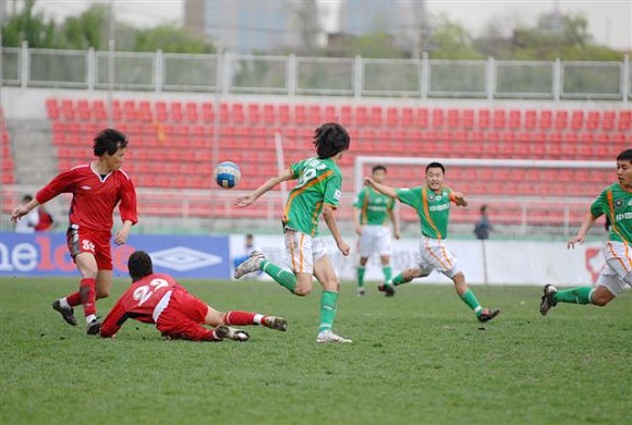 同時,孫禎鐸的頭球也吹響了毅騰隊進攻的號角。上半場十分被動的毅騰隊突然獲得了主動。第80分鐘時,毅騰隊有路獲得前場任意球,呂建軍將球發到左路后,毅騰隊員迅速起球,韓國外援陳順珍高高躍起,將球砸向球門,皮球應聲入網,1-0。
