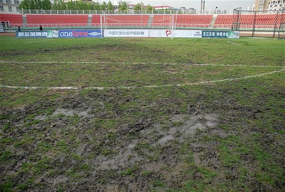 由于之前哈爾濱連續下雨,本來狀況就不是很好的哈工大體育場變得更加糟糕。