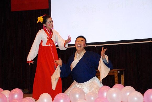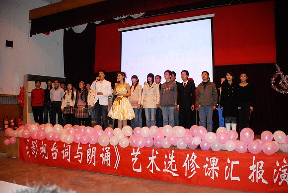 2007年12月13日晚七點(diǎn)整,在我校七號教學(xué)樓107報(bào)告廳,由藝術(shù)教育中心主辦,藝術(shù)教育中心楊海濱主任總策劃,藝術(shù)教育中心教師余鳳霞老師指導(dǎo)的《影視臺詞與朗誦》藝術(shù)選修課程匯報(bào)演出隆重舉行。人文學(xué)院副院長、藝術(shù)教育中心主任楊海濱老師,校新聞網(wǎng)編輯、高級攝影師段煉老師,以及藝術(shù)教育中心教師王穎、張乃鳳、王倩,許晶,曲香竹出席了晚會。