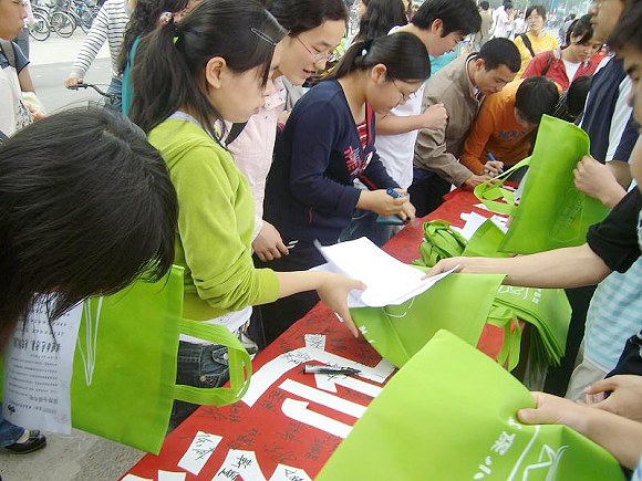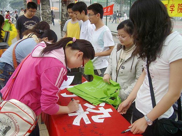 在活動中,我們倡議大家在橫幅上簽名,以表示自己支持綠色奧運、拒絕白色污染,簽名現場異常火爆。