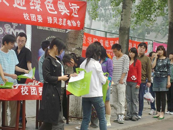 中午11點開始,綠風的成員在新食堂北側收拾好場地,做好了活動的準備。在我們掛出橫幅后,不一會就吸引了好多的同學詢問,成員們耐心的講解白色污染以及其危害的知識,并號召同學們放棄使用塑料袋,為北京奧運貢獻自己的一份力量,引起同學們的歡迎。在當時的情景中,我們可以感受到大家為北京奧運努力的熱切決心,使我們深受感動。