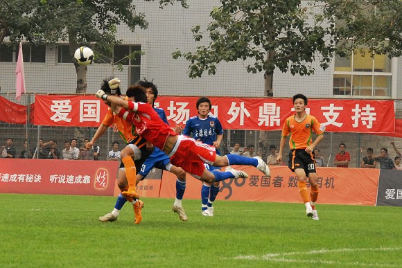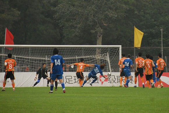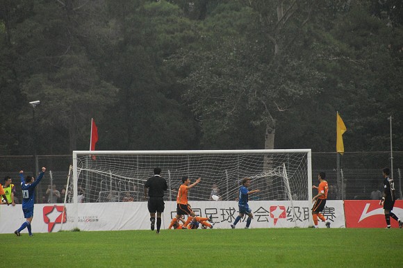 丟球后的北京愛國者隊迅速展開反攻,大舉壓上造成對方后衛直接回傳門將。但對方門將在禁區內玩火,頭球停球不慎,只好將球解圍出底線。
