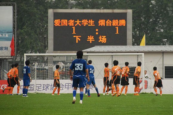 第25分鐘,舊攻之下煙臺毅騰隊終于將比分扳平。北理工在前場連續獲得任意球角球機會,但并沒有獲得機會。隨后在由攻轉守中北理工并沒有迅速站好隊型。煙臺毅騰隊從進攻左路發動進攻直接將球傳向后點,后點跟進的穆德拉格輕松停球在面對門將的情況下直接將球挑過門將,皮球在越過門線的剎那39號樸正煥頭球跟進將球打進,將場上比分扳成1-1。