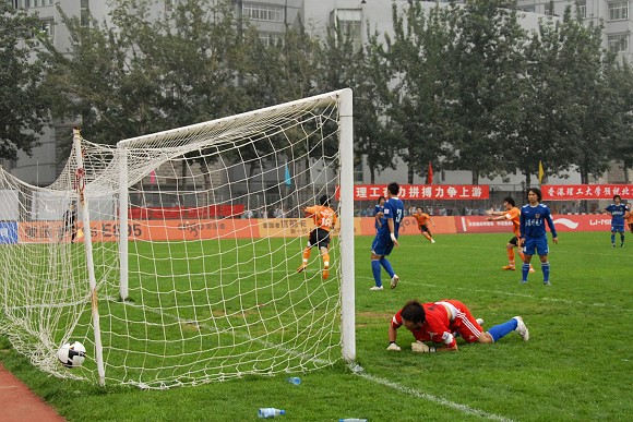 隨后北理工在前場右側進攻造成對手犯規獲得任意球機會,8號袁微將球開到后點,跟進包抄的隊員頭球攻門,對方門將將球奮力撲出,可惜門前并沒有埋伏的北理工球員,北京理工隊再次錯失一次機會。最終雙方在上半場暫時打成平局。