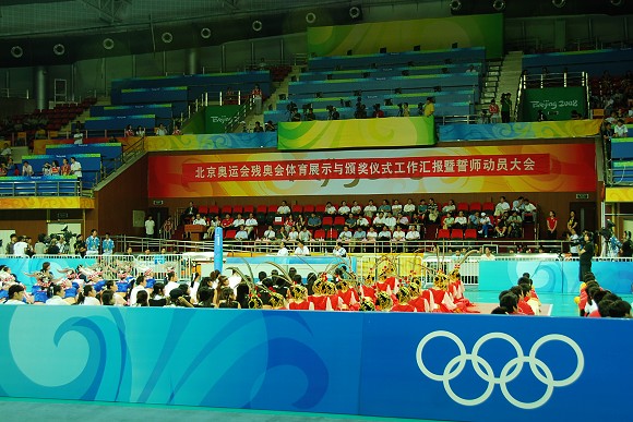 2008年7月20日,北京奧運會、殘奧會體育展示與頒獎儀式工作匯報暨誓師動員大會在北京理工大學體育館召開。北京市委常委、宣傳部長、北京市副市長蔡赴朝、北京市委宣傳部常務副部長肖培等出席。會議由北京奧組委執行副主席蔣效愚主持。