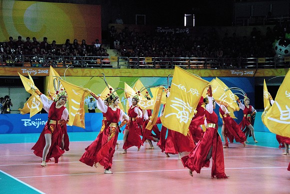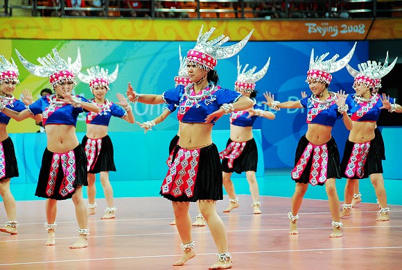 不同的民族風情韻味使現場觀眾群情激昂振奮,展現了中國56個民族手拉手、心連心喜迎奧運的畫卷。