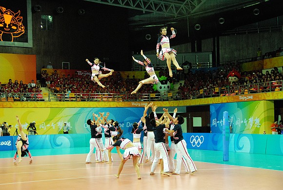 競技型拉拉操表演熱情活潑、激情四射,飽滿的精神和高難度的動作展示了競技拉拉操的力與美,感染了現場眾多觀眾,他們紛紛制造人浪來回應拉拉隊,臺上臺下2000多人一片和諧,全場氣氛爆棚。