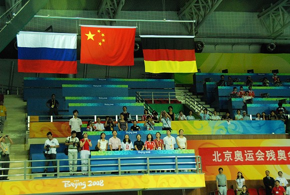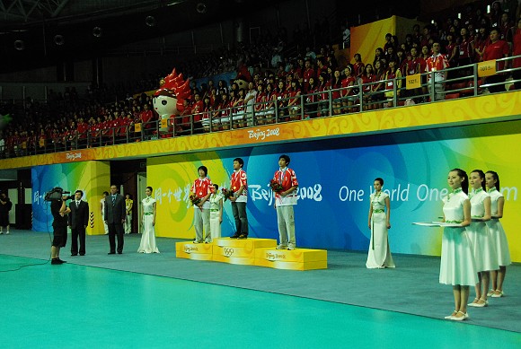 在頒獎演練中,奧組委選擇的是乒乓球這個中國奪冠希望最大的項目。具體則是男單項目的頒獎,由“國際奧委會主席羅格和國際乒聯主席沙拉拉”負責頒獎。有意思的是,模擬頒獎的3位“運動員”的名次劃分頗有點預言的意思。銅牌頒發給了德國的玻爾,銀牌頒發給了白俄羅斯的薩姆索諾夫,金牌則留給了中國的王勵勤。中國男單在經歷了雅典的失手之后,這次中國乒乓球隊準備非常充分。冠軍是否真的會被王勵勤奪走,我們拭目以待。