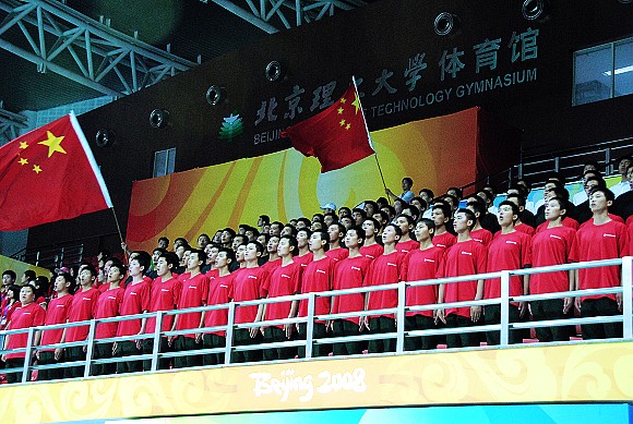 在升國旗演練中,據負責國旗的志愿者透露:奧運會真正頒獎時,將會有3套升國旗的方案。第一套是在電力充沛的情況下順利升起。而一旦電力不足,升旗儀式將會由人工進行補充。由于升旗旗桿比較重,若是完全停電,則需要5個人使盡全力才能把旗桿完全升起。在之前的一次演練中,曾經測試過由兩個人將旗桿拉起,但兩人共用了1分44秒。到目前為止,所有國家的國歌最長的也不過是55秒鐘。