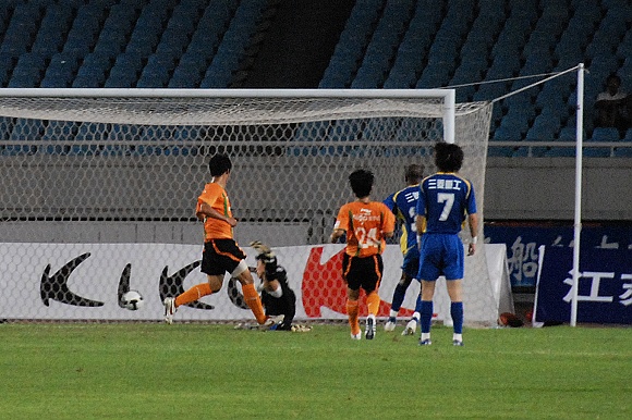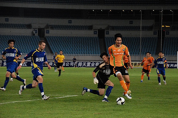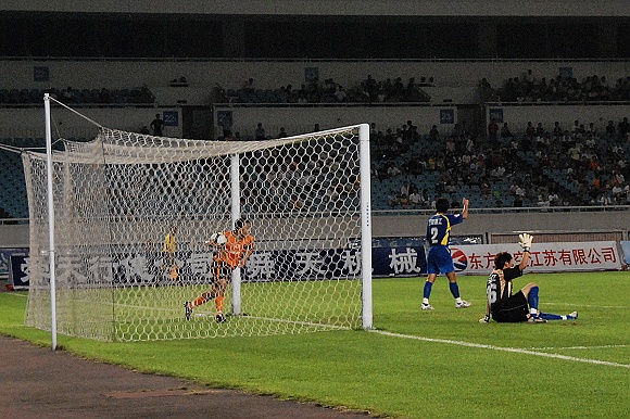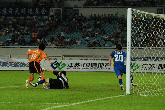 或許是優勢來的如此的輕松,讓舜天國信隊隊員多少有些松懈。比賽進行到第32分鐘,先是中場傳球失誤,接著門將關震又貿然出擊沒能及時回位,楊思源幾乎是打了一個空門,1:2。