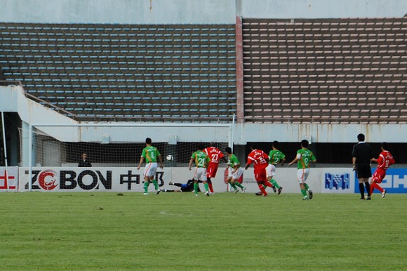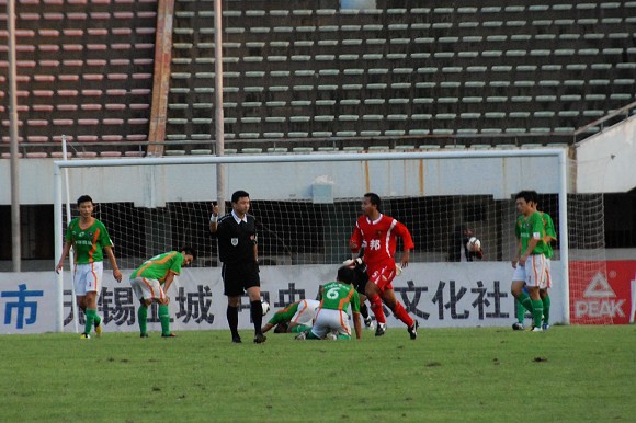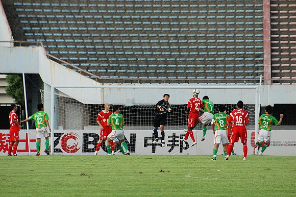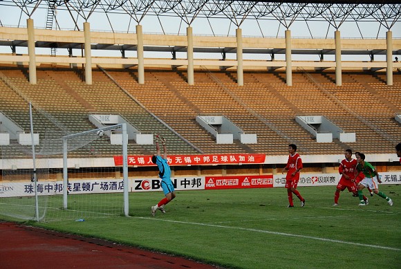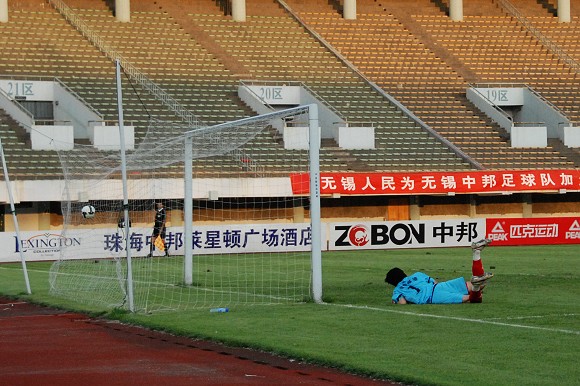 此后中邦隊完全控制了場上局面。第25分鐘,詹可強再次嘗試遠射,可惜射得太正。緊接著外援喬吉姆大禁區線附近胸部停球轉身抽射一氣呵成,可惜稍稍偏出球門。僅過三分鐘,無錫隊卷土重來,老將田野接到隊友傳球后離球門30米轟出重炮,北理工門將奮力撲出,上半場比分維持在1:0。