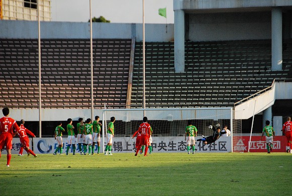 下半場易地再戰,無錫隊攻勢不減。第48分鐘,無錫中邦禁區前獲得任意球,離球門大約30米。以左腳定位球聞名的“小申思”宋博站在球前,隊友虛晃一槍,宋博直接射門,皮球劃出美妙弧線直飛死角,球中柱后彈入網窩,無錫中邦隊2:0領先。