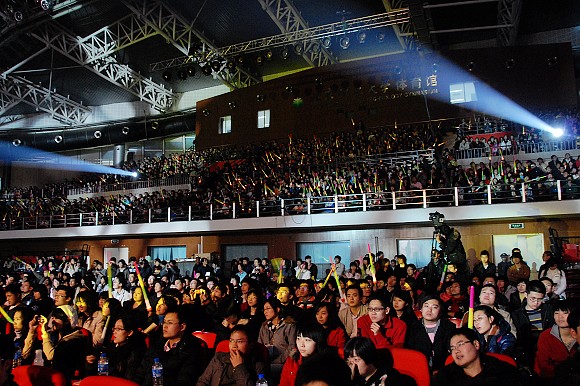 三千多名師生到現場觀看比賽。比賽在絢麗的燈光,此起彼伏的熒光棒與熱情的鼓掌加油聲中拉開帷幕。