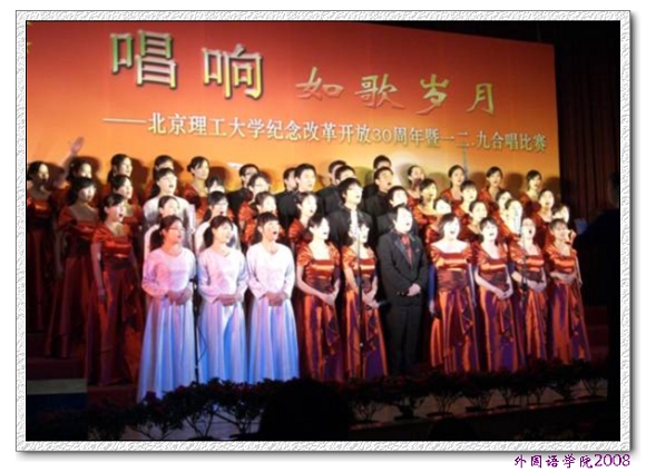 2008年12月7日晚,北京理工大學紀念改革開放30周年暨一二.九合唱比賽在中心教學樓一層報告廳隆重舉行。來自全校各個學院的13支合唱隊同臺表演,氣氛熱烈。經過激烈角逐,我院合唱隊以優秀的表現獲得三等獎,成績在13支合唱隊中名列第五,展現了我院學生的良好精神風貌和綜合素質。