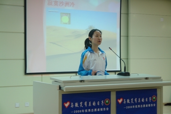 在報告會上,來自材料學院的張鵬、人文學院的黃霆、設計學院的計小瑩,分別用生動幽默的語言,分享了自己的奧運志愿服務經歷和收獲。他們用一個個小故事講述了在奧運志愿者大家庭中相互支持和幫助的《我的150個天使》,志愿者的在工作中那些《酸酸的快樂 甜甜的憂傷》,以及在20歲時那一年《1/20的收獲》。報告團的“替補成員”校團委宣傳調研部部長張巍老師,代替正在準備博士生入學考試的吳曼,講述了“志愿者平方”是如何做到了《平凡的付出“平方”的愛》。
