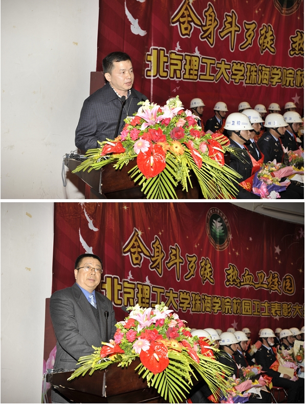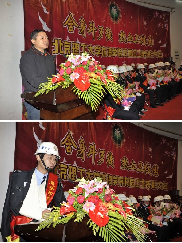 珠海學院院長、黨委書記龐思勤教授頒布嘉獎令,先進個人代表保安員張旺發言