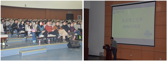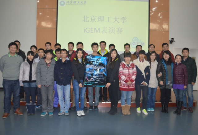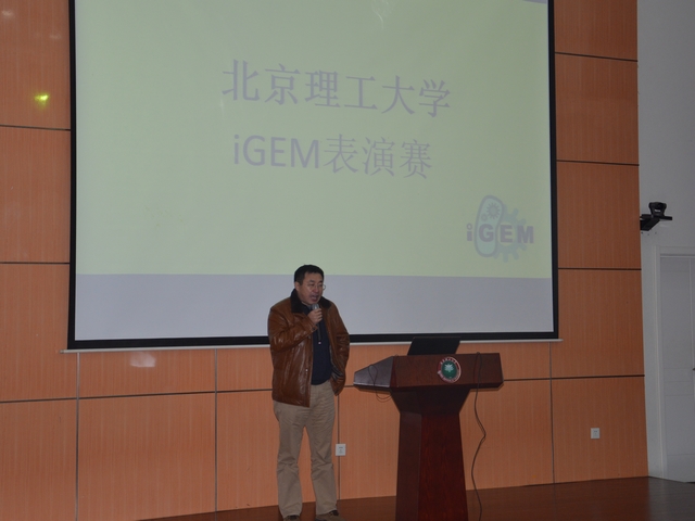 為了營造良好的大學生課外科技創新氛圍,培養低年級同學的科研興趣,北京理工大學iGEM兩支代表隊受邀于2013年12月8日上午,在北理工良鄉校區綜教報告廳進行iGEM表演賽。出席此次大賽的有生命學院院長鄧玉林,副書記、副院長周連景,現代生物與醫學工程研究中心副主任慶宏、空間生物與醫學工程研究所馬宏、生命學院團委書記王一飛、生物工程系主任科研助理賈海洋同學。會議由生命學院本科生輔導員歐先國主持。