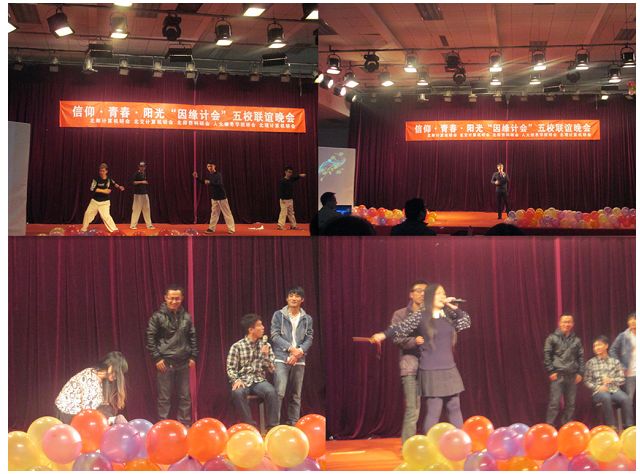 晚會開場,伴隨著舒緩悠揚的旋律,來至五大高校的主持人以風趣幽默、輕松活潑的開場白瞬間帶動了全場的氣氛,在熱烈的掌聲和歡呼聲中,聯誼晚會正式開始。