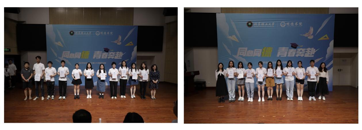 明德書院德昭班學育導師組長鄭佳然、德正班學育導師組長薛少華、人文與社會科學學院學生工作辦公室主任、團委書記顏笑、外國語學院學生辦公室主任、團委書記馬鏈、明德書院原朋輩導師、2018級學生代表李彥沨、馮靖涵等為明德書院優秀畢業書生頒發榮譽證書。
