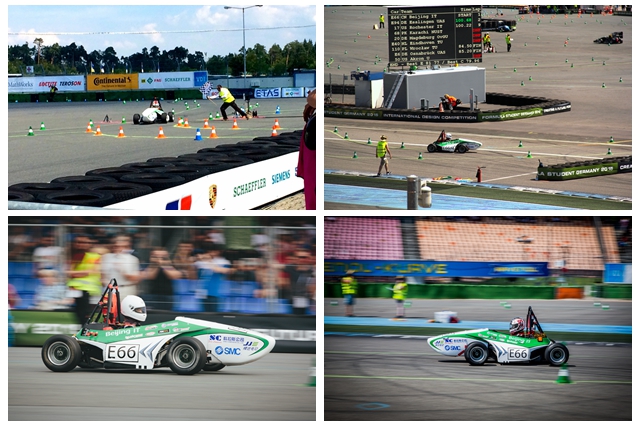 8月1日下午,“銀鯊IV”迎來了馳騁賽道的機會。在高速避障動態測試中獲得 81.64秒的圈速,按照“圈速倒序發車”的原則,在8月2日的耐久賽中,于中午12:30發車登場。耐久賽是大學生方程式汽車大賽中的最后一項測試內容,也是最容易出現失敗的環節。德國賽的賽道設計非常緊湊,低速彎和高速直線的銜接非常突然,車輛總是在急加速和急減速的狀態下行駛,對于車手的熟練度、車輛的動力性和穩定性是非常嚴峻的考驗,因此也非常具有觀賞性。由于屏蔽電磁干擾不夠完善,比賽的過程中賽車幾次險些失去動力,但終歸有驚無險,由2名車手跑完了18圈共計22公里的比賽。“銀鯊IV”在格子旗的揮舞下沖過終點,與其他11輛純電動賽車和27輛汽油機賽車一起,共同享受完賽的喜悅。