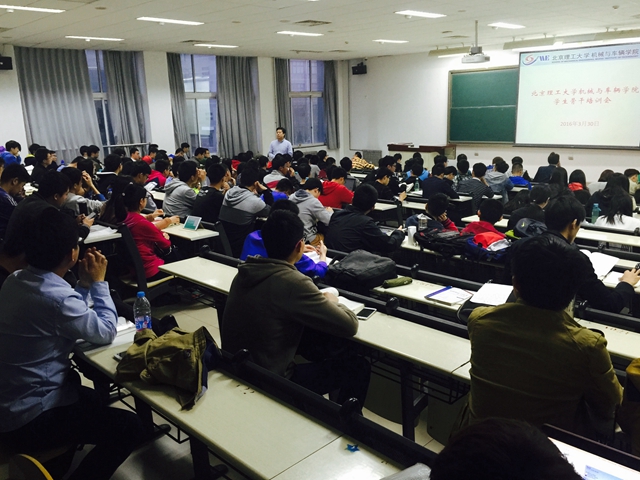 2016年3月30日晚6:30,機械與車輛學院本科生一二年級學生干部培訓會在良鄉校區理科教學樓203舉辦。學院黨委副書記副院長范文輝、團委書記郝佳馨、研工委書記韓陽、生涯發展指導服務中心主任張雨甜、團委副書記李超、輔導員程繼超、馬凱以及學院2014級、2015級本科生班團學生干部、各社團組織學生骨干等近兩百人參加了培訓會。