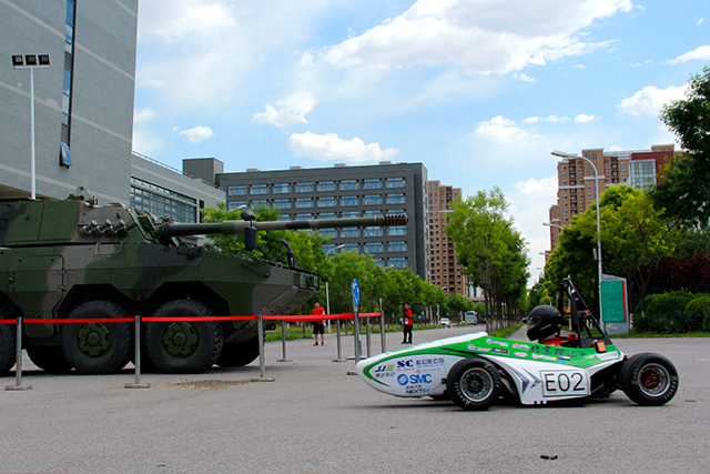 5月15日,放晴后湛藍的天空讓更多的同學走出了宿舍,11時許,同學們期待已久的賽車開始按照既定節目單進行動態表演,方程式賽車、無人賽車在已改造成為臨時跑道的操場南側路上進行直線加速與高速避障表演。極速靈動、貼地飛行的方程式賽車已經賺得了一陣陣的掌聲后,無人賽車的遙控駕駛更是讓同學們驚嘆不已,這樣一個龐然大物竟然在操縱者手中的手柄控制下靈活地繞起樁來。