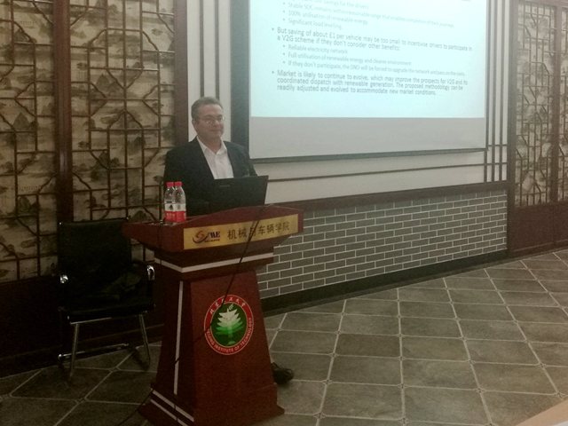 何洪文教授詳細介紹了此次學術(shù)論壇的籌辦組織情況,鼓勵研究生積極參加學院組織的各項學術(shù)活動,并對Sharkh教授表示了熱烈的歡迎。Sharkh教授作了題為“Optimal Coordination of Vehicle-to-grid Batteries and Renewable Generators in a Distribution System”的主題報告。Sharkh教授針對目前電動車輛逐漸普及將帶來的車輛智能充電方面的問題,詳細地講述了他和他的團隊的最新研究成果。提出了在某分布式系統(tǒng)中Vehicle-to-grid (V2G) 模式下電池和可再生能源發(fā)電的協(xié)同優(yōu)化的解決方案。分析指出該方案對于降低能源消耗、提高系統(tǒng)效率、減少用戶消費、緩解環(huán)境壓力等方面都有重要的意義。報告結(jié)束后,Sharkh教授與在場的師生進行了深入的交流討論。