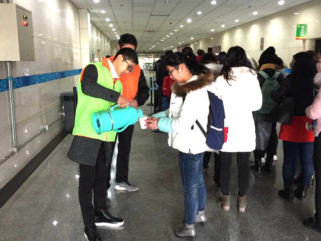 近期北京接連遭遇降雪、大風,招聘會當天的最低氣溫已接近零下十度,出現極寒天氣。招生就業工作處專門安排大學生就業協會志愿者為參會學生提供飲用熱水和紙杯,還在保證現場秩序的情況下,安排參會學生在體育館內排隊等候并提前入場應聘。
