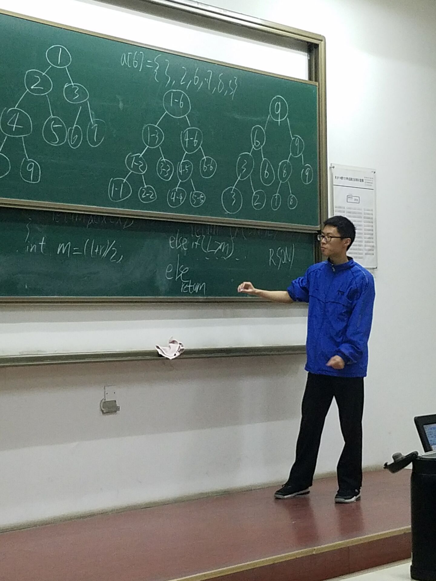 第二周培訓由基地算法實驗室2015級成員李東同學開展基礎培訓,講解深度優先搜索;李宇輝同學開展進階培訓,講解線段樹算法。2016級優秀學生韓有方輔助學長,詳細講解和點評上一周的練習題目。李東同學從一個簡單的路徑搜索入手,展示了這種搜索策略的大體思想,在臺下同學理解這種思想之后,又將深度優先搜索拓展到了更廣闊的應用范圍里,同時以“八皇后”問題為例引入回溯法這一重要編程思想。臨下課時,李東同學鼓勵大家多實踐,多在紙上模擬并體會深度優先搜索的算法流程。在接下來的一個小時里,李宇輝同學帶來本學期第一次進階培訓——線段樹的講解。李宇輝同學詳細闡述了線段樹的組織結構、時間優勢、內存占用等問題,每當臺下同學們面露難色時就停下并留給大家一定的思考時間。課后,李宇輝同學解答了同學們的一些疑惑,并再次強調要多思考、多畫圖來理解這一數據結構。