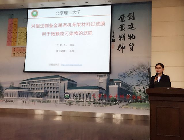 陳凡同學作為北理工代表進行匯報交流工作,主題為“對輥法制備金屬有機骨架材料(MOFs)過濾膜用于微顆粒污染物的濾除”,本課題的指導老師是王博教授。陳凡同學向在場的專家評委和其他高校師生介紹了她所參與的科創工作以及取得的成果,得到了專家評委們的一致好評,并最終獲得一等獎的好成績。文化節同時開展了教師交流、武漢大學實驗室參觀與交流等多項內容。