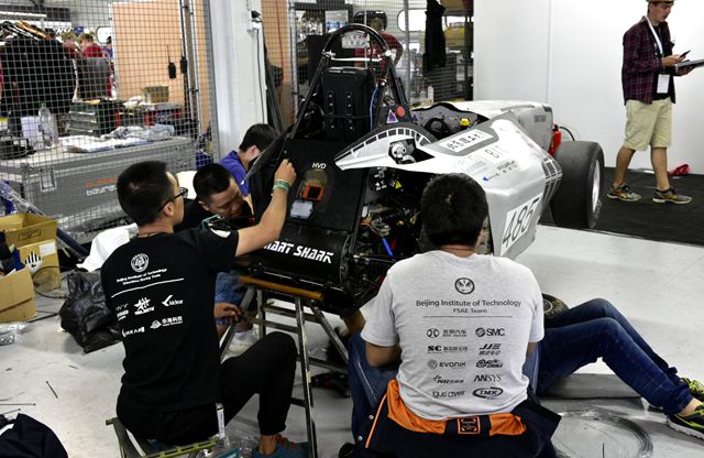 賽場上隊員們努力檢修賽車,積極準備比賽