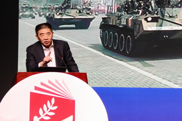 10月22日下午,著名軍事專家、軍委科技委兼職委員、央視特約評(píng)論員杜文龍主講“我國(guó)安全環(huán)境與戰(zhàn)略選擇”講座。杜文龍引用習(xí)近平總書記提出的“總體國(guó)家安全觀”,從真實(shí)的歷史故事入手,強(qiáng)調(diào)了國(guó)家安全意識(shí)對(duì)每個(gè)國(guó)民的重要性。他從公共空間、虛擬空間、陌生空間三個(gè)領(lǐng)域介紹了何為國(guó)家安全、如何使我國(guó)更加安全;從“一島三?!薄耙淮蟊娦 钡冉嵌确治隽宋覈?guó)周邊的國(guó)際關(guān)系和安全形勢(shì),介紹了各鄰國(guó)對(duì)我國(guó)的外交策略。